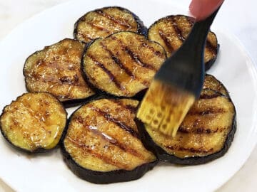 Grill the eggplant slices until golden brown and fork-tender, about 5 minutes on each side. In my dual-contact electric grill, I grill for 5 minutes on one side, then 2 minutes on the second side.