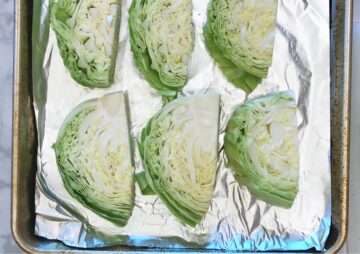Rinse the cabbage wedges, then carefully dry them using paper towels. Place the wedges in a single layer on the prepared baking sheet.